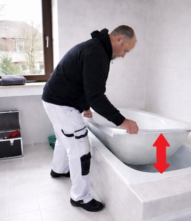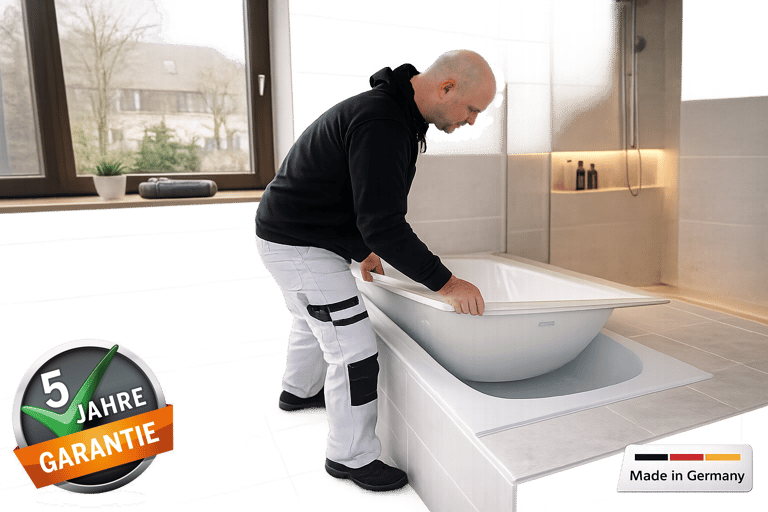 Nach der Lieferung wird die neue Wanne fachgerecht in die vorhandene eingesetzt, mit einer neuen Ab- und Überlaufgarnitur ausgestattet und sorgfältig mit Sanitärsilikon verfugt. Nach einer Trocknungszeit von etwa 24 Stunden ist Ihre Badewanne wieder uneingeschränkt nutzbar.